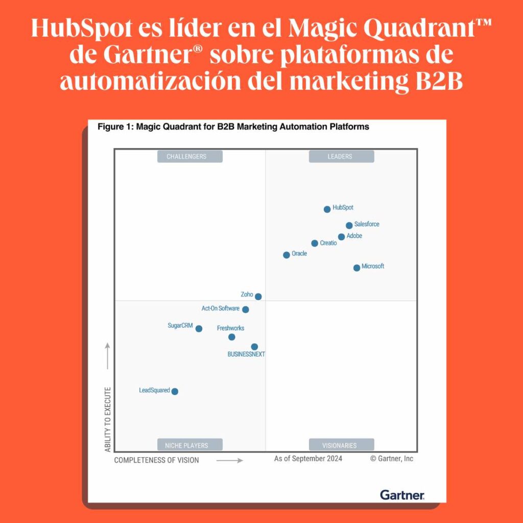 HubSpot ha sido reconocida por quinto año consecutivo como líder en el Magic Quadrant™ de Gartner® 2025 para plataformas de automatización del marketing B2B<br />